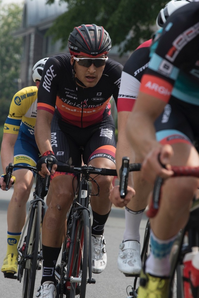 „Vorhergesagt waren Regen und starkes Gewitter und die Besetzung des GP Buchholz war sehr stark, u.a. mit Heizomat Rad-Net, einem dänischen KT Team, sowie das Hamburger Stevens-Team in voller Mannschaftsstärke. Tolle Aussichten für das nächste Rennen nach der LVM, bei der ich gnadenlos zersägt wurde. (Anm.der Redaktion.: Nach offensiver Fahrweise sind Jan bei der LVM „die Lichter ausgegangen“ und er konnte das Rennen nicht beenden) Die C-Klasse, stolz mit dabei Domenic und ich, hatte eine Minute Vorgabe auf das KT A/ B Feld. Mein Plan: von Anfang an draufhalten und versuchen, diese Minute über die 90 km und 30 mal über den Anstieg bis ins Ziel zu retten. Tolle Idee. Fanden auch Domenic und mein Teamkollege vom Canyon Rad Race Team John Göhner. Also fuhren wir von Anfang an Vollgas und versuchten, uns abzusetzen. Domenic fuhr eine Attacke nach der anderen und konnte gar nicht genug davon bekommen, die Nase in den Wind zu halten. Und Wind gab es reichlich. Dank seiner Arbeit gelang es uns tatsächlich uns von den anderen C-Fahrern abzusetzen. Also waren wir plötzlich die Spitze des Rennens. Nach ungefähr 50 km Paarzeitfahren bekamen wir Besuch aus dem Hauptfeld und unsere Spitzengruppe wuchs auf 5 Mann. Mit dabei Madison-Weltmeister Theo Reinhardt (Heizomat-Rad Net), ein dänischer Renner sowie Dennis Klemme (Stevens). Irgendwann waren es dann nur noch vier, weil Domenic uns leider verließ. Nach seiner Leistung in den 70 km davor aber kaum verwunderlich, Hut ab Domenic! Kurz vor dem Finale überrundeten wir noch das Hauptfeld, welches darauf das Rennen beenden musste. Auf den letzten hundert Metern fehlte mir leider die Kraft um mit zu sprinten. Somit wurde es ein vierter Platz und der Sieg in der Gesamt-Sprintwertung, da ich bei den Prämiensprints ausreichend Punkte sammelte.“ Respekt Domenic und Jan. Toll gemacht!