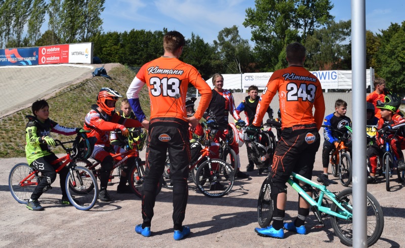 Besonderes Highlight in diesem Jahr war der international besetzte BMX-Workshop am Samstag vor dem Renntag. Die sympathischen Niederländer Niek und Justin Kimmann waren in bester Laune und fühlten sich sichtlich wohl auf der Bahn, die sie zum ersten mal besuchten. Entspannt und sehr professionell führten sie mit den insgesamt 39 Nachwuchsfahrern, die in mehreren Gruppen starteten, ein Übungsprogramm durch, mit dem jeder etwas anfangen konnte.