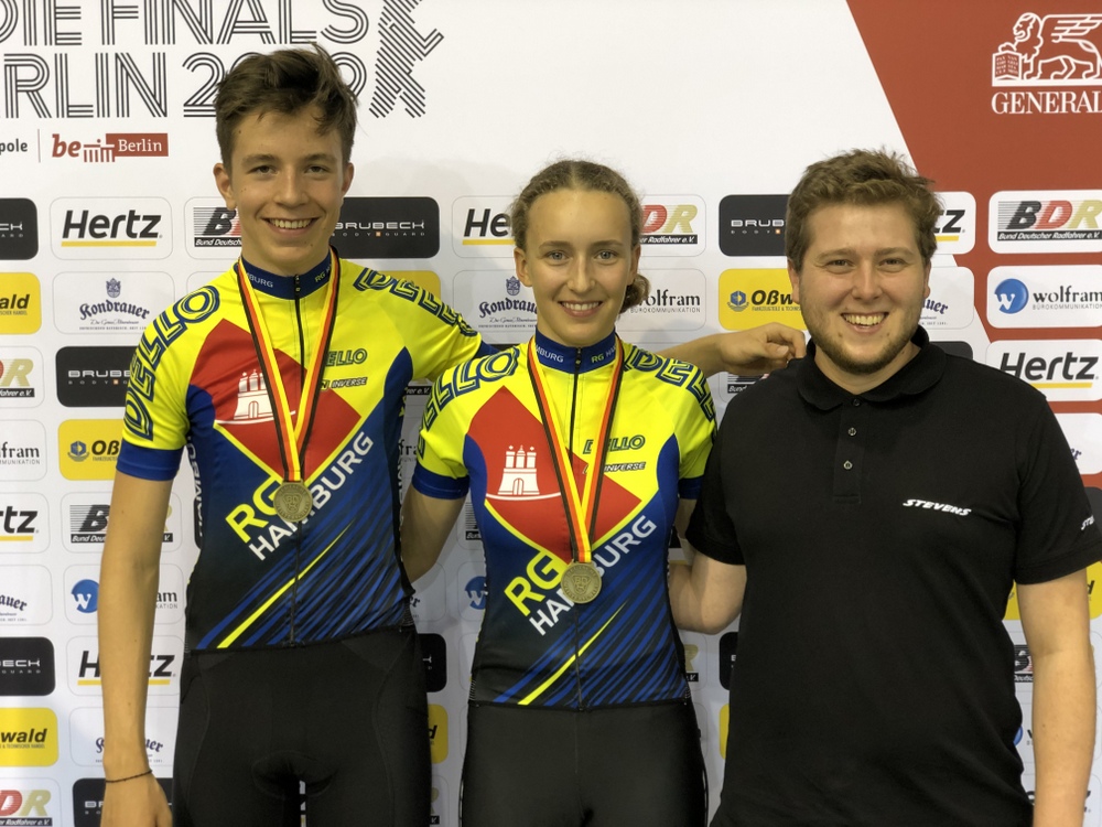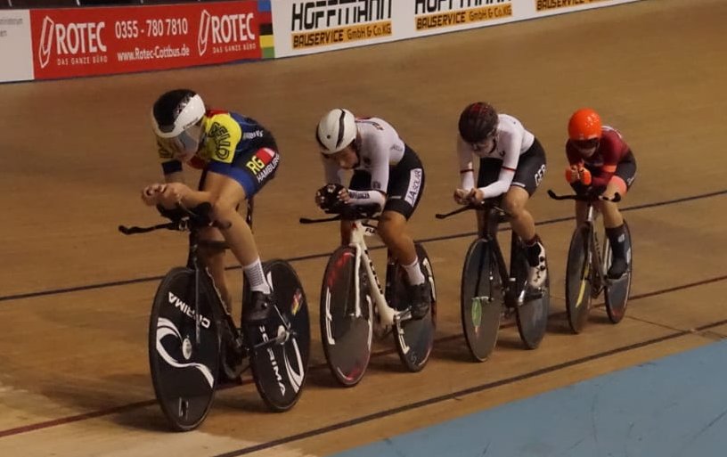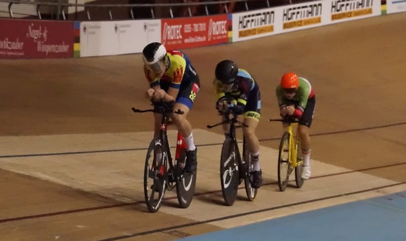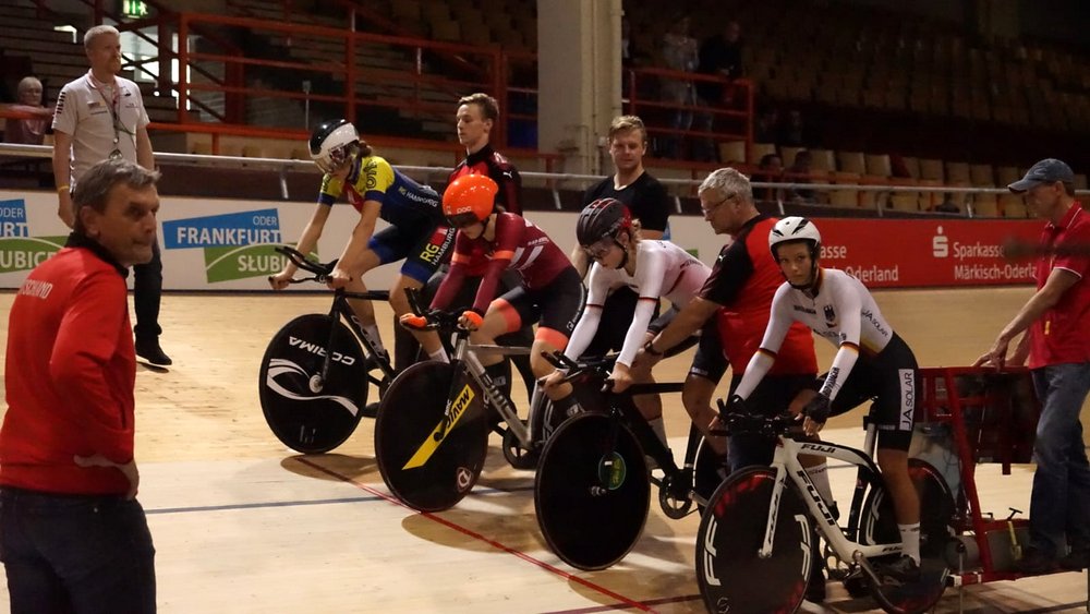 „Für Noa und mich war es jeweils das erste Rennen in der Altersklasse U19. Während bei mir das Fahrerfeld zum größten Teil aus Fahrerinnen meines Jahrgangs bestand, da einige Fahrerinnen bei der Straßen-WM am Freitag gestartet sind, war das Fahrerfeld bei Noa mit ca 40 Jungs sehr gut besetzt. Am Freitag standen für mich die 500 Meter und für Noa 1000 Meter mit stehendem Start auf dem Programm. Wir beide hatten eine Gang Vorgabe, worauf wir uns nur begrenzt vorbereiten konnten. Noa als 14. hat dann auf jeden Fall mit einer 1:07 min trotzdem richtig einen raus gehauen. Am Samstag stand die Einerverfolgung an. Bei Noa lief es mit einer 3:34 min für das erste Mal über die 3000 Meter Distanz ganz gut, trotzdem gibt es noch Luft nach oben. Ich hatte sehr gute Beine und konnte meine persönliche Bestzeit über 2000 m aus Berlin um knapp 2 Sekunden verbessern. Die Zeit von 2:33 min reichte um Zweite bei 15 Starterinnen zu werden. Abends folgte das Ausscheidungsfahren. Noa fuhr im ersten Lauf der besten 24 mit. Das Rennen war vom Start weg sehr schnell, womit Noa nicht direkt gerechnet hat und Schwierigkeiten hatte sich zu positionieren und wurde 20. Ich hatte wieder sehr gute Beine, jedoch auch Probleme mich zu positionieren. Das hat mir viele Körner gekostet. Ich konnte aber trotzdem mit einem dritten Platz zufrieden sein. Dank der guten Zeit in der Einerverfolgung durfte ich am Sonntag dann im BDR Vierer fahren. Der lief ganz gut, wir haben aber auch noch viel Luft nach oben. Noa ist in einem Mix Vierer gestartet. Obwohl bereits nach 1 km nur noch drei Fahrer dabei waren, fuhren die anderen 3 ganz harmonisch auf Platz 7. Zum Abschluss sind wir noch Madison gefahren. Ich war mit meiner Partnerin Fabienne Jährig (SC Berlin) gut im Rennen. Wir konnten konstant punkten. Das bedeutete am Ende einen sehr guten zweiten Platz mit Punktegleichstand auf die Erstplatzierten. Noa hatte ein bisschen Pech mit dem Material (und den Beinen), wodurch sein Partner und er das Rennen eher als Trainingswettkampf mitgenommen haben. Am Ende des Wochenendes waren wir beide ziemlich platt und fertig. Wir freuen uns jetzt jedenfalls sehr uns auf unsere Saisonpause und darauf, im nächsten Jahr wieder mit voller Kraft anzugreifen. Vielen Dank auch an unseren Trainer Leo!