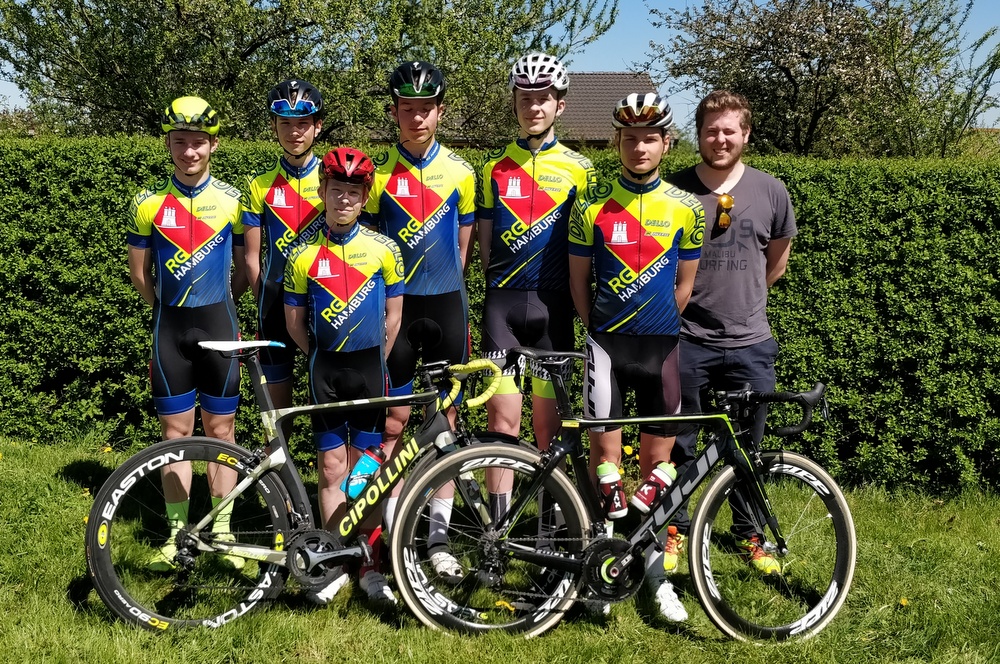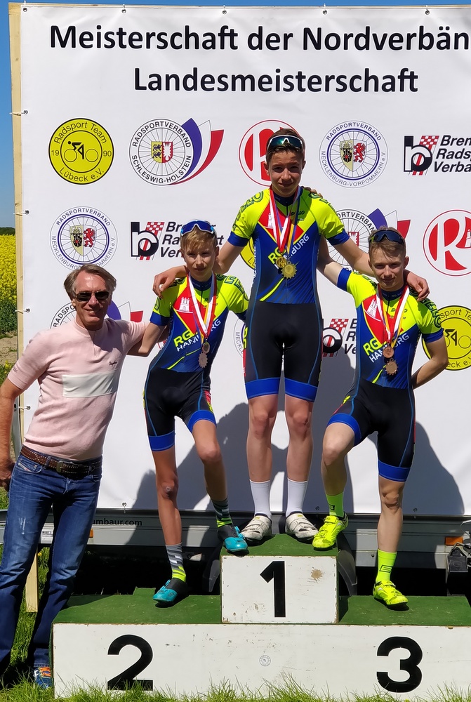 „Wie jedes Jahr machten wir uns am ersten Maiwochenende auf zu den Nordmeisterschaften. Ziel war es, wie schon in den Jahren zuvor, möglichst viele Medaillen zu gewinnen. Besonders für das Jugendrennen hatte ich als Trainer große Hoffnung auf gute Ergebnisse. Samstag starteten alle Sportler beim Zeitfahren. Alle zeigten eine ansprechende Leistungen. Benet Metz und Daniel Prien verfehlten nur knapp den Sprung nach ganz oben auf das Podest. Benet kam mit 10 Sekunden und Daniel mit 16 Sekunden Rückstand zum Sieger ins Ziel. Herzlichen Glückwunsch an ihren Freund und Kumpel Jasper Pahlke (Harvestehuder RV). Es folgten auf den Plätzen 4, 5 und 6, – auch im Ranking der Nordverbände – Noa Metzler, Cedric Stein und Noah Böker.