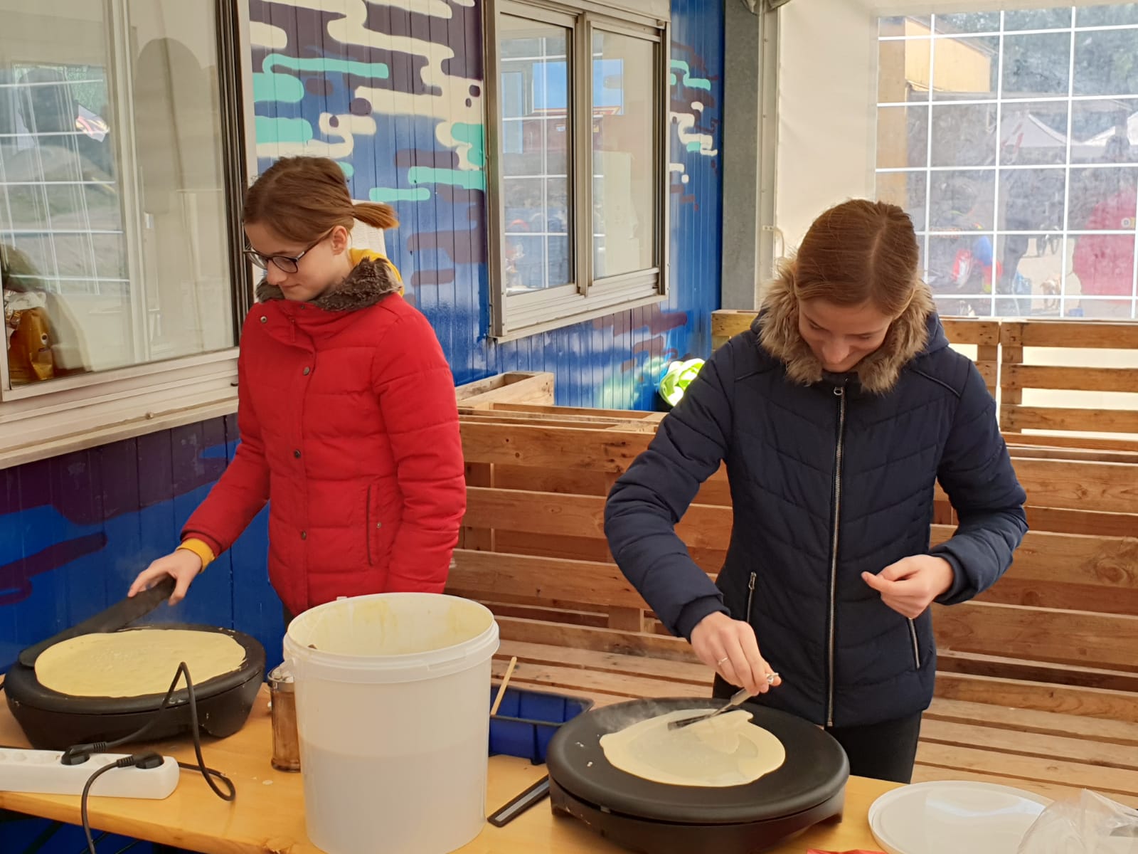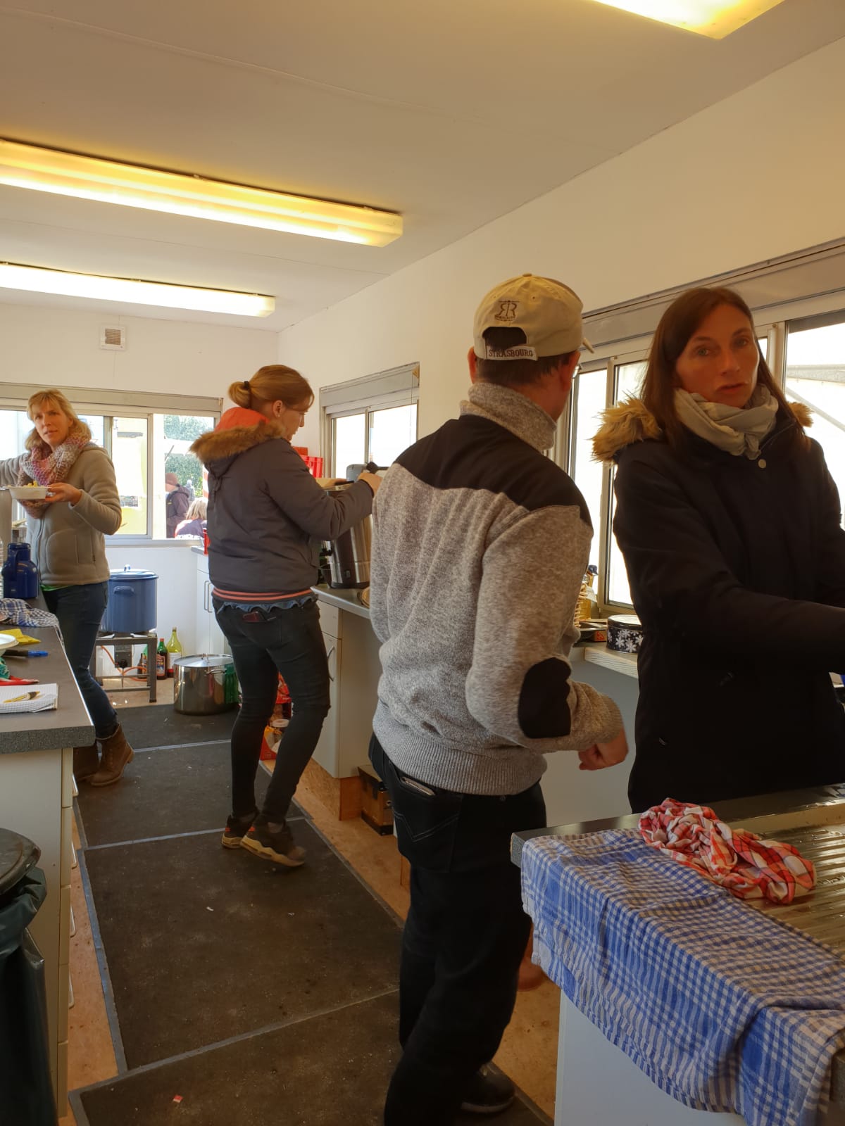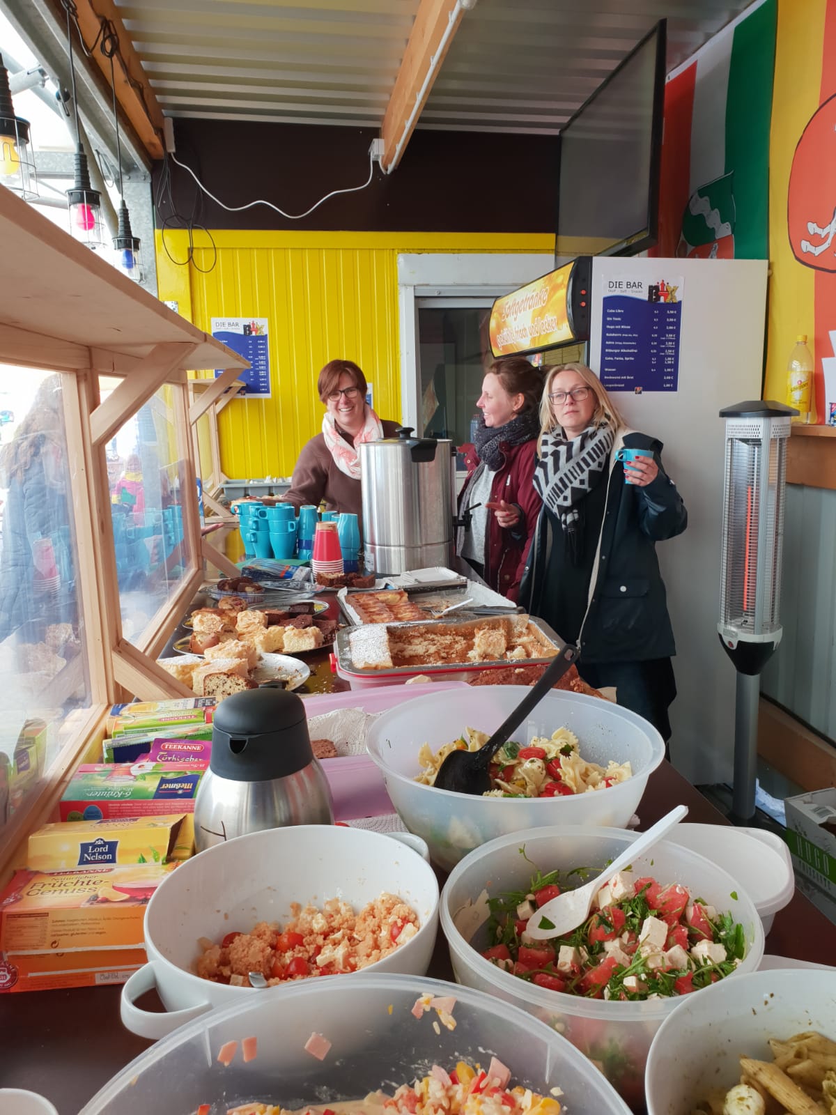 Und dann wieder Handschuhe an und Kaffeebecher abwaschen. Wir behalten die Zeit im Blick. Um 11.00 Uhr brauchen die ersten Sportler ihre Nudeln. So stellen wir den Gaskocher um 9.30 Uhr an. Der Topf ist riesig, es dauert bis das Wasser kocht, aber die Flamme heizt die Küche auf. Langsam werden unsere Füße wieder warm. Nachdem wir den Topf zu viert unter großer Kraftaufwendung abgegossen haben, stellen wir uns wie am Fließband auf. Einer füllt die Nudeln in die Plastikschüsselchen, der nächste gibt Tomatensauce darüber und der dritte bestreut das Ganze mit Parmesan. Ab nun hallt es vom Verkauf nur noch „Einmal alles!“, „Ohne Käse!“ oder „Nur Nudeln mit Tomatensauce!“ zu uns hinein. Bevor die Nudeln leer sind, haben wir schon fast die nächsten fertig. Das Schaufeln und Bestreuen geht nahtlos ineinander über. Wir sind ja vorbereitet!