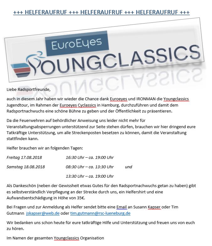 Helferaufruf Youngclassics 2018 Helferaufruf für die Youngclassics 2018Helferaufruf zur Youngclassics 2018 Liebe Radsportfreunde, anbei ein Helferaufruf für die Youngclassics 2018. Eure RG-Hamburg teilen teilen mitteilen Oliver Bott2018-05-29T16:13:53+02:00Mai 29th, 2018|