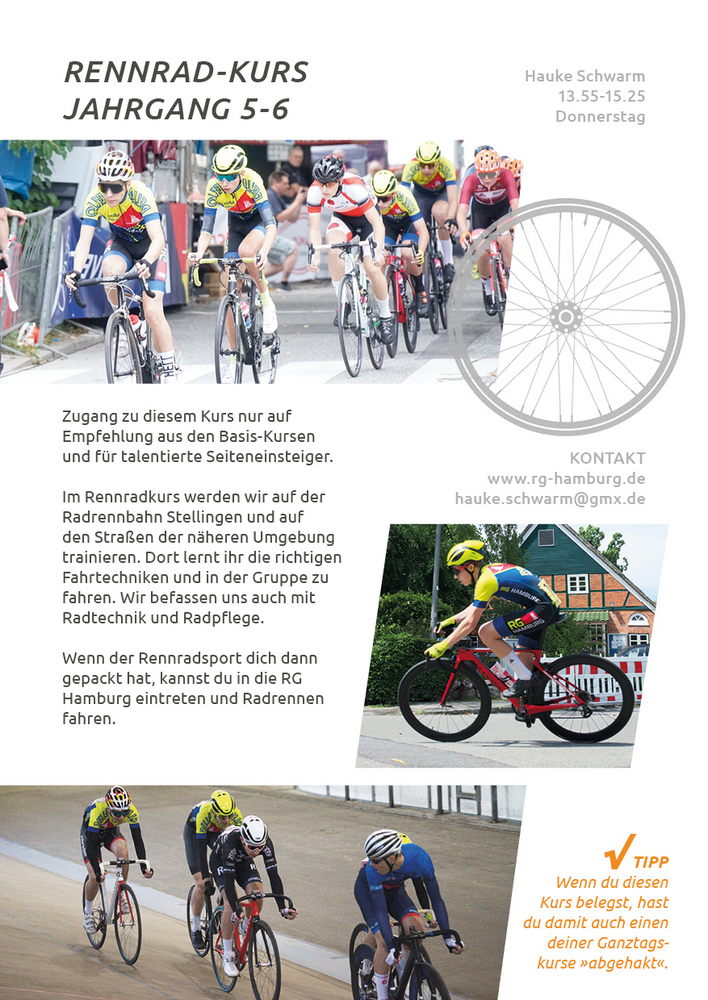 Auch im neuen Schuljahr wird die beliebte Radsport AG an der Stadtteilschule Stellingen im Rahmen des Ganztagskonzeptes angeboten. Seit 2005 ist das Radsport-Projekt dort fest verankert. In Kooperation mit der RG Hamburg haben zahlreiche Talente Ihre Lust am Fahrradfahren im unterschiedlichsten Terrain entdeckt. Schuleigene Mountainbikes, Cyclecrossräder oder auch Rennräder können gestellt werden. Geübt werden Fahrtechniken im Gelände, Radtechnik, Radpflege, kleinen Reparaturen, wie man als Gruppe mit dem Rad unterwegs ist und welche Regeln im Straßenverkehr gelten. Ideale Trainingsmöglichkeiten finden sich im nahe gelegenen Volkspark und Niendorfer Gehege. Bei Interesse wird dann im Herbst gemeinsam bei den Cyclecross- Wettkämpfen des Stevens-Cup gestartet. Hier stellte die Schul-AG in der Vergangenheit mehrfach den Sieger oder die Siegerin in der Hobby-Nachwuchsklasse. Projektleiter Ralf Hinke: „ Sollte ein Schüler oder eine Schülerin über die AG hinaus Interesse am leistungsorientierten Rennsport zeigen, stehe ich beratend zur Stelle“. Schon einige Talente wie etwa Philipp oder Daniel Prien, Hannes Anders oder unser derzeitiger FSJdler und Co-Trainer Hauke Schwarm fanden über die AG den Weg zum lizenzierten Vereinssport und wurden Mitglied der RG Hamburg. Diese bietet über die AG hinaus auch professionelles Nachwuchstraining auf der Stellinger Radrennbahn an.