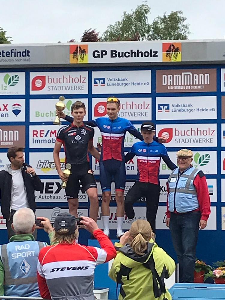 Noah Bökers: „In Buchholz ging es 13 mal um den 3 km langen Rundkurs, der auch einen Anstieg kurz vor dem Ziel aufwies. Das Rennen ging für mich leider nicht so gut los: Maxi und ich sind direkt in der ersten Runde gestürzt. Maximillian Karrasch konnte das Rennen dann leider nicht mehr beenden, aber ich konnte Dank der Rundenvergütung wieder ins Rennen gehen. Ich habe dann mehrfach versucht wegzufahren, zunächst vergeblich. Weil ich wusste, dass ich nicht so gut im Sprint bin habe ich in der letzten Runde alles auf eine Karte gesetzt und habe unten am Berg attackiert. Bis zum Ziel wurde ich dann nur von einem anderen Fahrer eingeholt und wurde am Ende zweiter. Auch beim heutigen Specialized-Cup habe ich oft attackiert und konnte das Feld auf vier Fahrer reduzieren. Leider hat es am Ende im Sprint wieder nur für den zweiten Platz gereicht. Zufrieden kann ich aber trotzdem sein, denke ich. Beim Specialized-Cup konnte ich erneut auf Platz 2 sprinten. Somit bin ich mit meiner Form aktuell sehr zufrieden.“