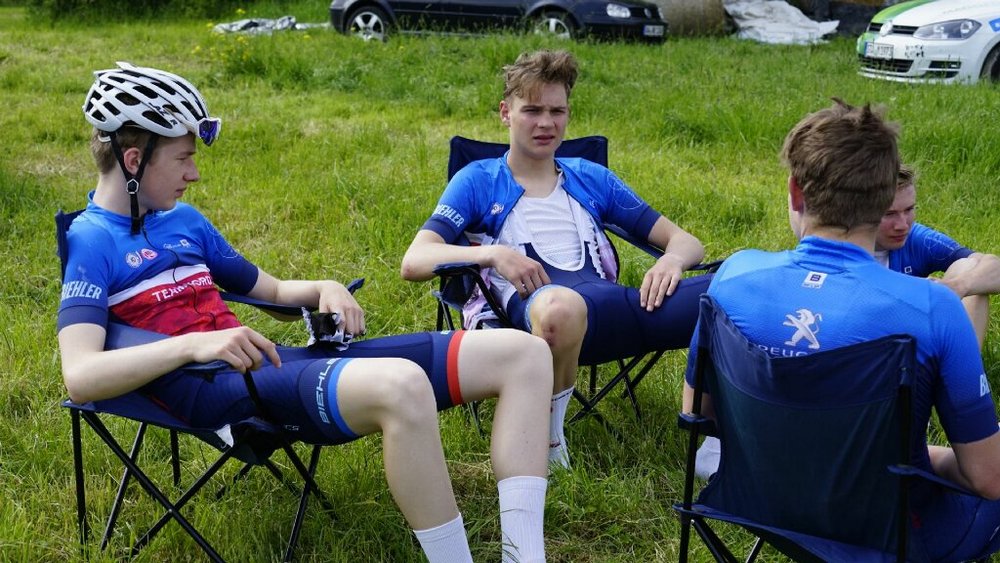 Wie es den Jugendfahrern erging, berichtet Noah Böker: „ Beim Sichtungsrennen in Karbach hatte ich endlich wieder das Gefühl dass die Formkurve bergauf zeigt und richtig mitfahren konnte. Die Strecke kam mir allerdings auch sehr entgegen. Zwei steile Anstiege haben dafür gesorgt, dass immer mehr Fahrer aus dem 140 Mann starken Feld fielen. Ich konnte mich immer vorne im Hauptfeld halten, das am Ende noch 60 Fahrer groß war. Leider habe ich als Leichtgewicht dann in den Abfahrten Positionen verloren, sodass ich im Sprint am Ende des Feldes reinkam. Noa und Cedric hatten an dem Tag leider nicht die Beine, um mit den Besten mitzuhalten.