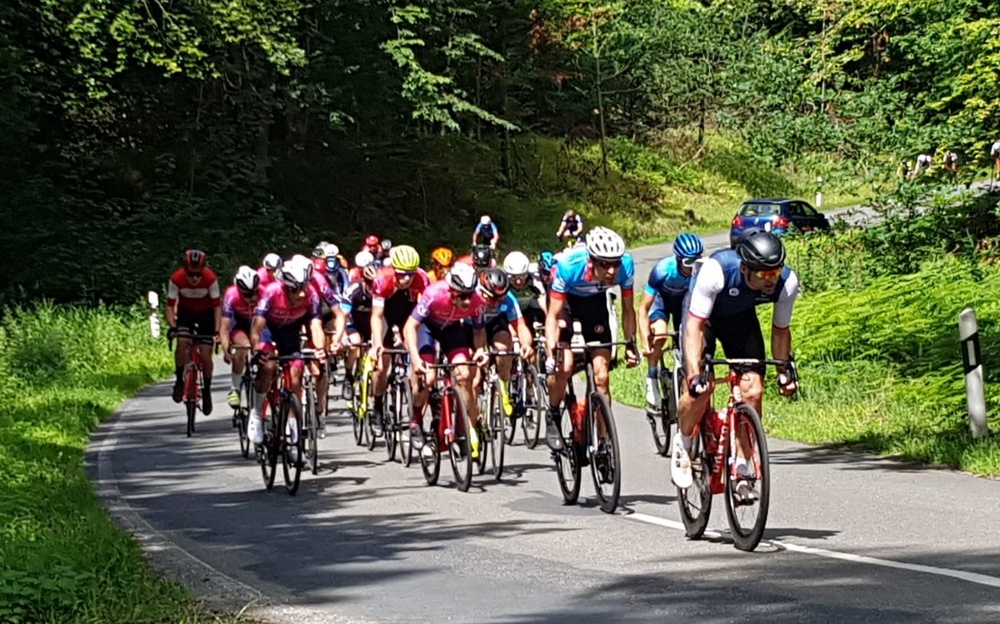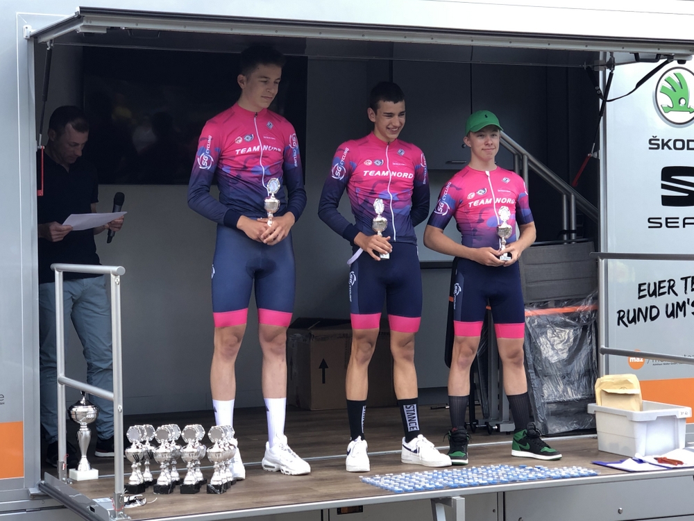 Da es das erste Rennen nach Corona war, gab es natürlich strenge Vorschriften und Regeln, damit sich keiner ansteckt. So durften die Fahrer sich bei der Startaufstellung nur mit viel Abstand aufstellen, was ein ungewohntes Bild ergab. Obwohl so vieles anders war, tat es glaube ich allen gut, nach der langen Pause mal wieder richtig Rennen zu fahren. Am Freitag gab es ein Prolog-Zeitfahren über eine hügelige Strecke, auf der wir eigentlich alle ganz gut gefahren sind. Noa Nick gewann die U19 Wertung. Am nächsten Tag fand das Highlight der Rundfahrt statt, die lange Straßenetappe. Für die U19 Junioren 100 Kilometer und für Hauke in der U23 120 Kilometer. Insgesamt konnten wir uns als Team sehr gut im Jedermannfeld behaupten. Natürlich war das Rennen was die Konkurrenz angeht, nicht vergleichbar zu den normalen Lizenz-Rennen die wir sonst fahren. Nachdem wir zwischenzeitlich mit vier Fahrern vom Team Nord in der Flucht waren und uns in allen Runden Bonussekunden für die Gesamtwertung sichern konnten, wurden wir zum Ende hin eingeholt. Ich gewann am Ende das Rennen im Sprint. Am Sonntag stand dann noch das abschließende Zeitfahren an. In der U19-Gesamtwertung gewann dann Team Nord BL-Kollege Silas Koch, vor Noa und mir. Hauke wurde in der U23-Kategorie Zweiter, wobei er das abschließende Zeitfahren sogar gewann. Marcus Baranski wurde ebenfalls 2. in der Masterklasse und fuhr beim 21 km langen Zeitfahren in 27.:05,95 min einen 46,5 Km/h Schnitt auf hügeligem Terrain! Auch die anderen RG Hamburg Fahrer zeigten gute Form und Leistung, so dass wir alle zufrieden und zuversichtlich für die nächsten Rennen gestimmt, abreisten. Sportliche Grüße, euer Noah!